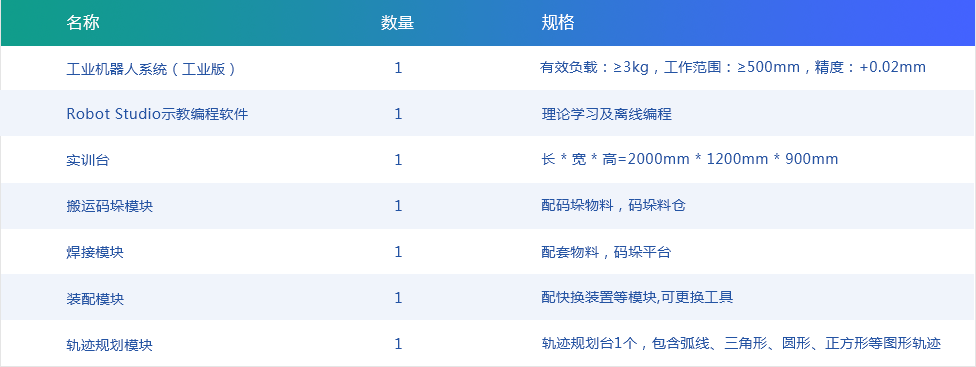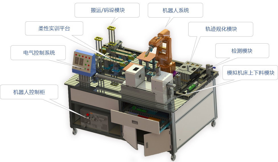 此实训装置由机器人系统、柔性实训平台、工作模块、控制系统等组成,整体设计为模块化开放式结构,客户可按需求选配模块(常用模块:搬运/码垛模块、轨迹规划模块、检测模块(视觉或传感器)、模拟喷涂模块、模拟焊接模块、模拟打磨模块、装配模块、模拟切割模块、模拟机床上下料模块、立体仓库模块、坐标标定模块等),各模块位置可调,拆装方便,在满足教学示教需求的同时,也可作为学校研发的相关产品实验平台。